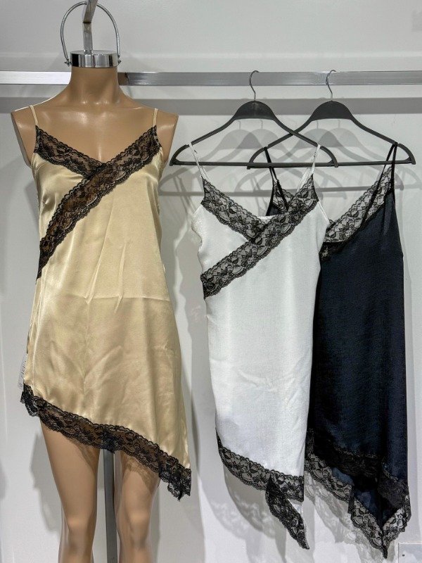 Vestido lencero de Sedita con encaje. Caída en pico lateral y tiras en el hombro reguladoras. Disponible en 36 (abarca S/M)