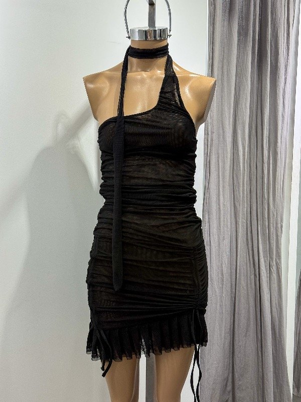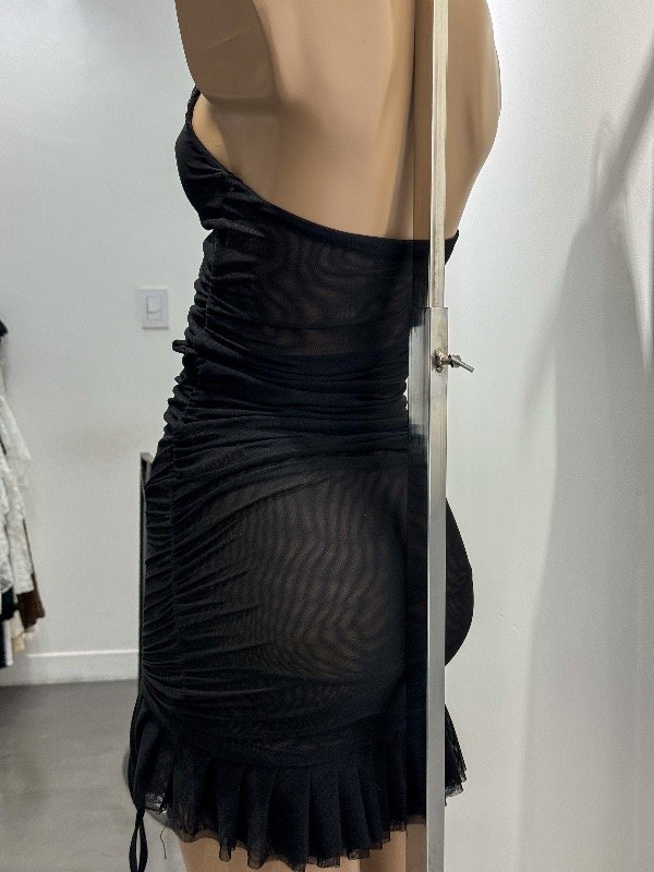 Vestido de lentejuelas corto al cuerpo con amplio tajo lateral, cuello en V con encaje. Talle único, abarca un S.