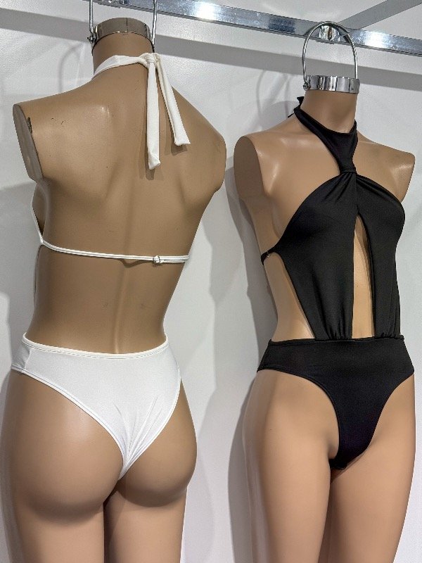 Body de microfibra cuello cerrado con nudo delantero y multiple escote. Tira para regular en espalda y broches en la parte inferior. Talle único, abarca S/M.