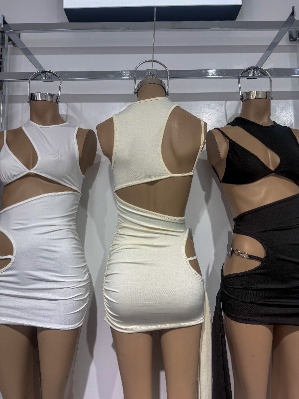 Vestido de microfibra con múltiples recortes y lazo colgando en un lateral. Talle único, abarca S/M.