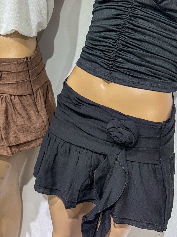Mini de volados con rosa lateral y volado colgando. Cierre lateral. Talle único, abarca 36/38.