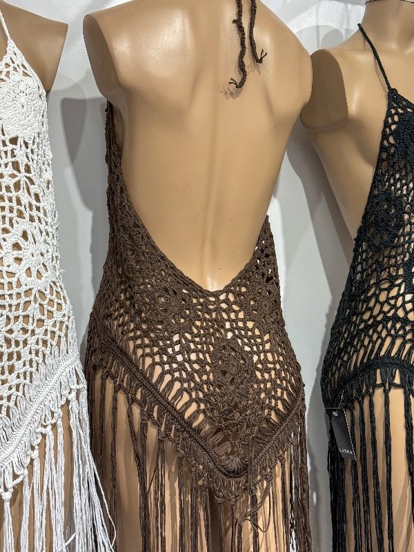 Vestido crochet calado con tira para anudar en el cuello y espalda ultra cavada. Talle único, abarca un M.