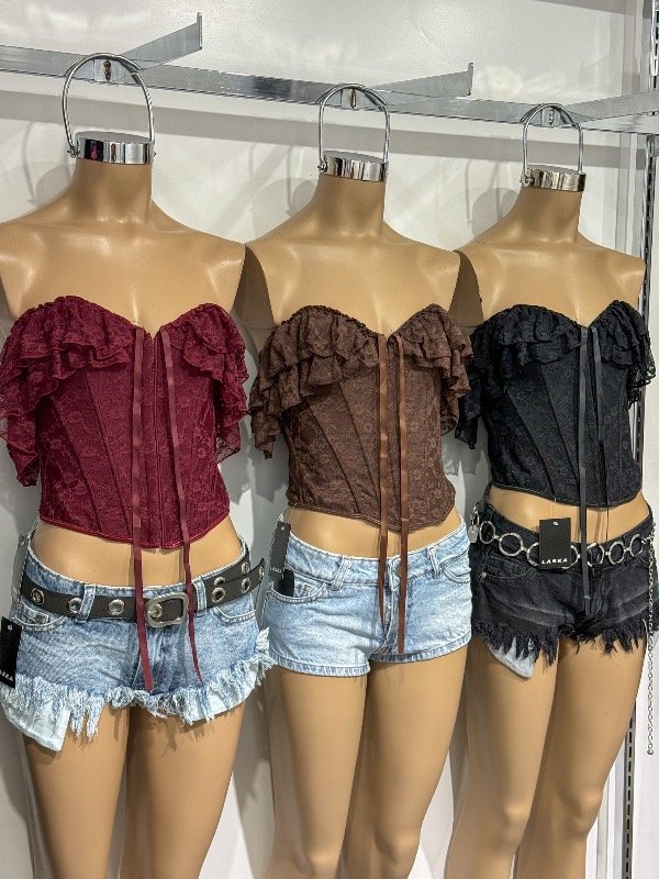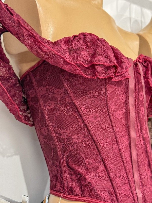 Corset de encaje con voladitos cuello bote y broches delanteros. Talle único, abarca un M.