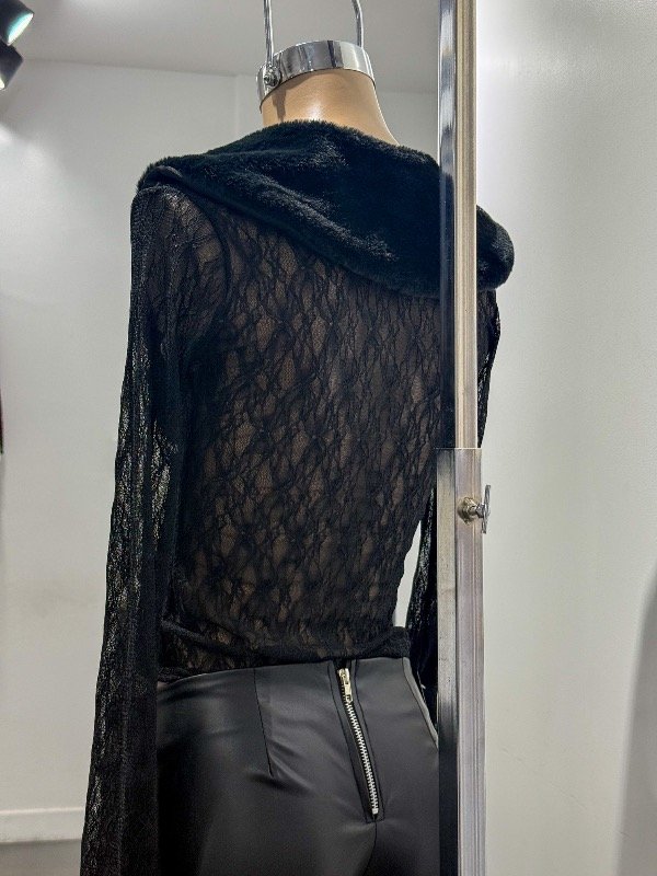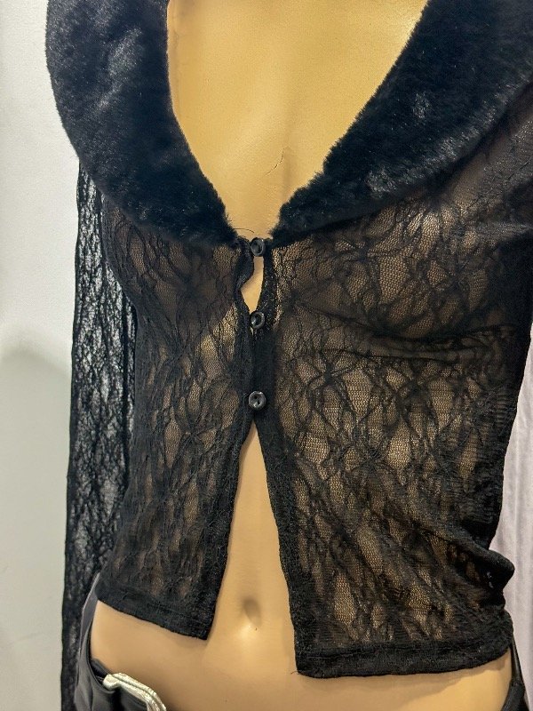 Top tipo saquito de encaje tramado con cuello de piel, botones delanteros y manga Oxford. Talle único, abarca S/M.