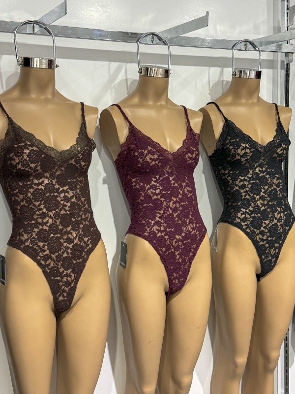 Body de encaje con puntilla y broches inferiores. Talle único, abarca S/M.