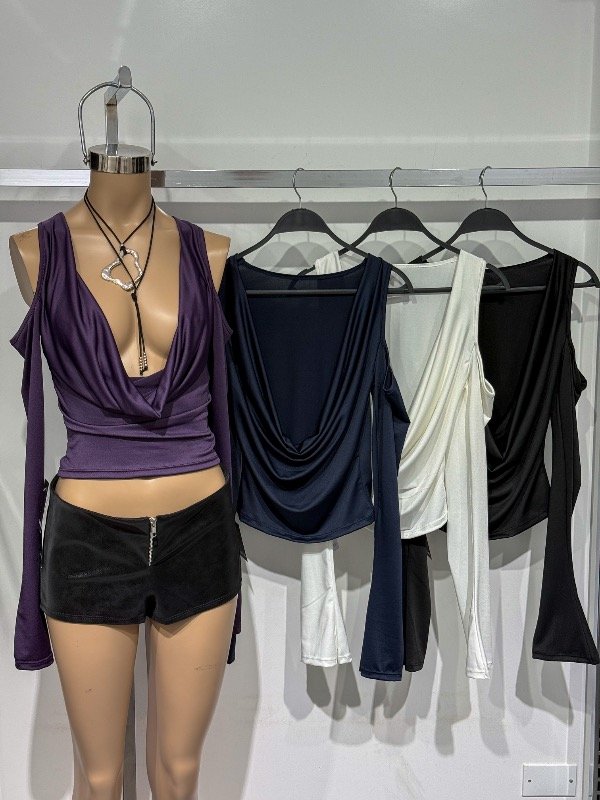 Top de microfibra manga larga con escote en hombros y cuello buche. Talle único, abarca S/M.