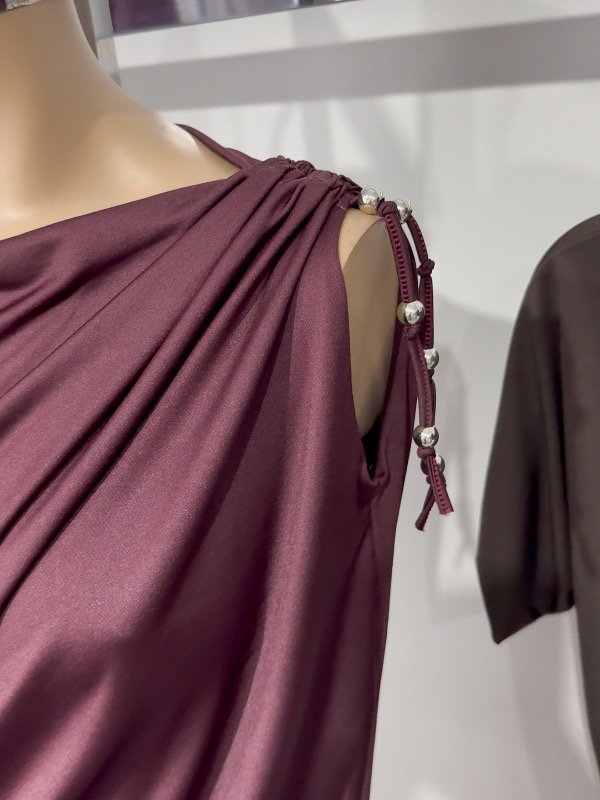 Vestido de microfibra holgado en la parte superior y al cuerpo en la inferior. Detalle de tiras reguladoras en hombro con pelotitas plata para fruncir. Talle único, abarca S/M.