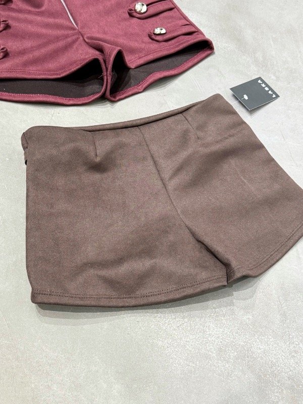 Short agamuzado con cierre y botones delanteros. En la parte de atrás tiene pinzas. Talle único, abarca 36/38. Medidas Aproximadas: CADERA 33cm LARGO 29cm TIRO 27cm