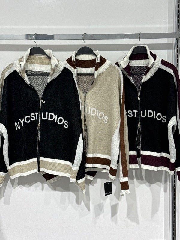 Campera de hilo combinada con estampa, cuello alto con doble cierre. Talle único, abarca hasta un L.