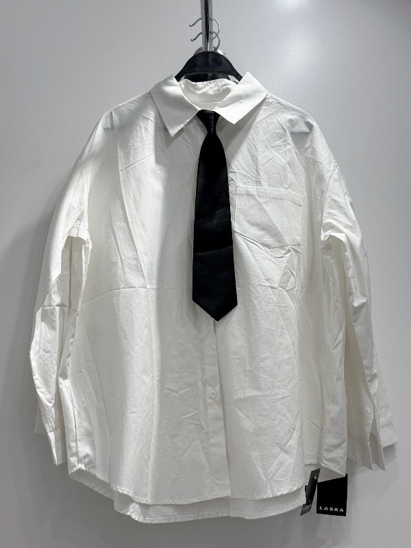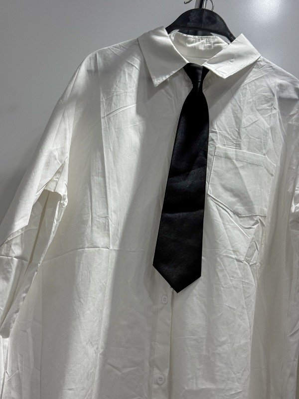 Camisa Oversize blanca de tela poplin con botones, y bolsillos. Incluye una corbata con cierre para regularlo. Talle único, abarca hasta un XL.