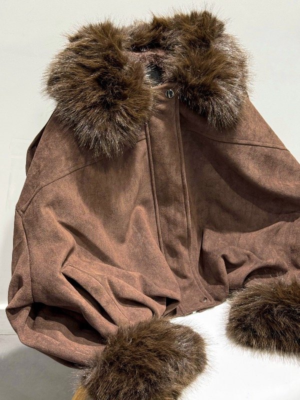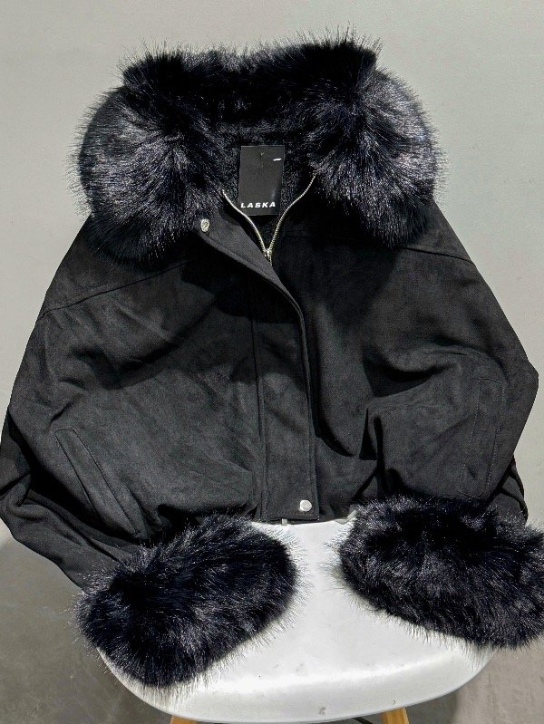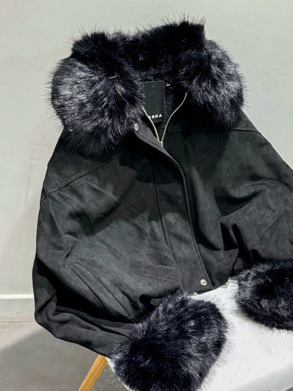 Campera Bomber de gamuza forrada en todo su interior con peluche, tiene cierre, bolsillos y solapa con broches a presión. Capucha y mangas de piel desmontables. Disponible en talle S/M. Medidas aproximadas: LARGO 54 cm - ANCHO 73cm