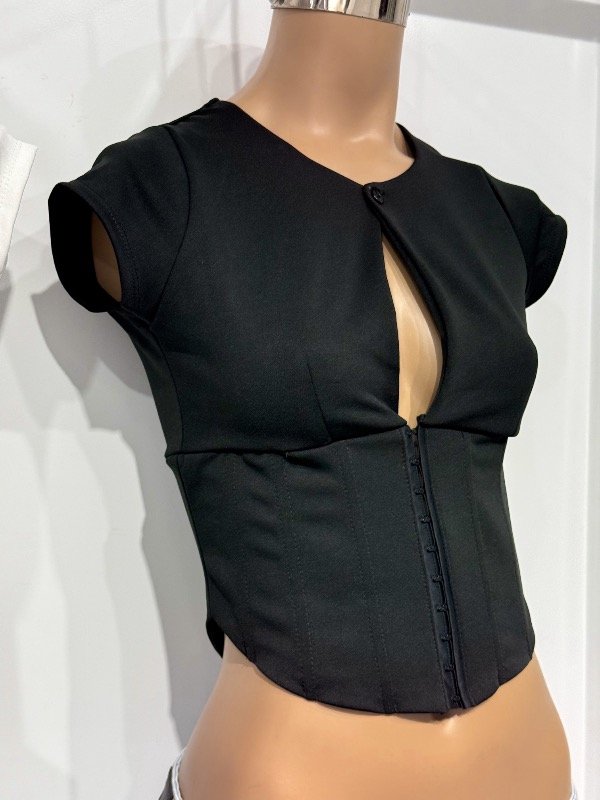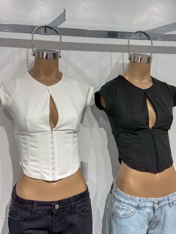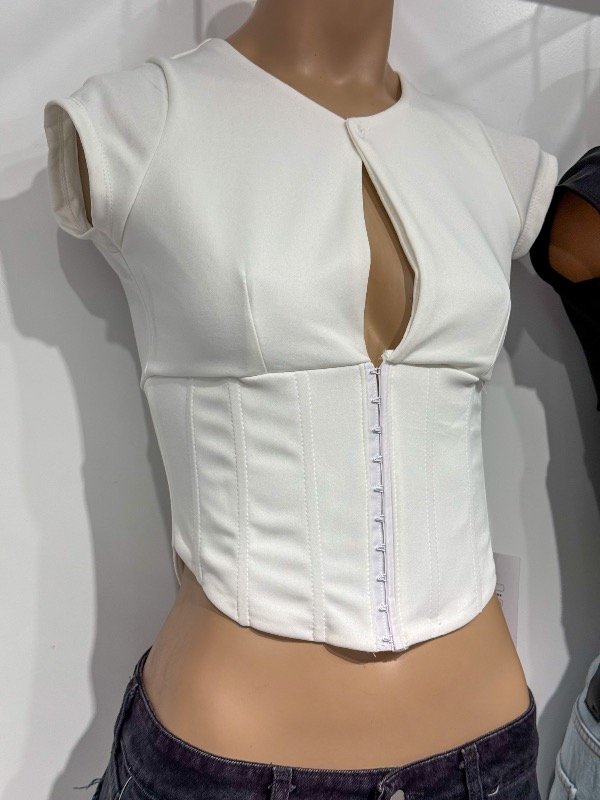 Top de microfibra gruesa con botón, escote gota, ballenas y broches delanteros. Talle único, abarca S/M.