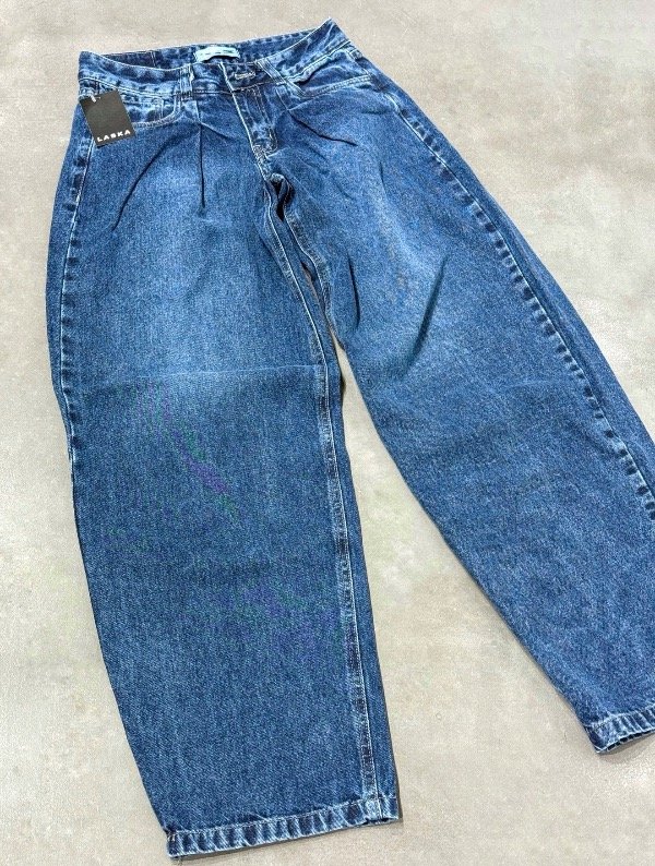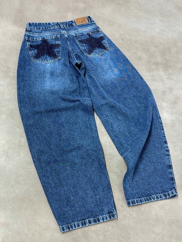 Pantalon denim color azul tiro bajo con pinzas delanteras, y estrellas marcadas en azul más oscuro. Disponible por talles. Medidas aprox: