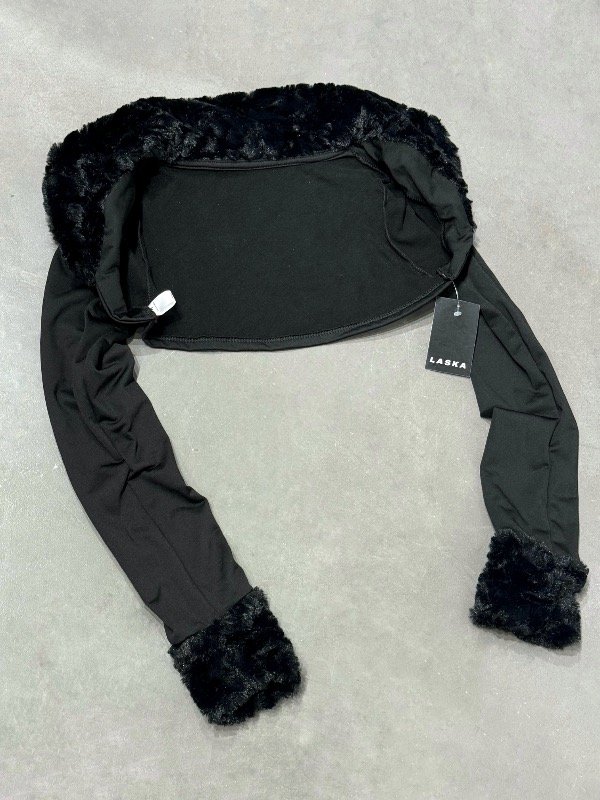Saquito Crop de acetato soft frizado con piel en el cuello y en puños. Talle único, abarca S/M