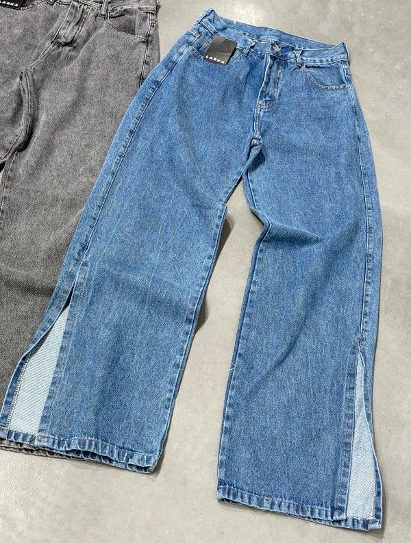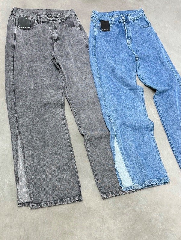Pantalón denim tiro medio alto con tajos laterales. Disponible por talles. Medidas aprox: