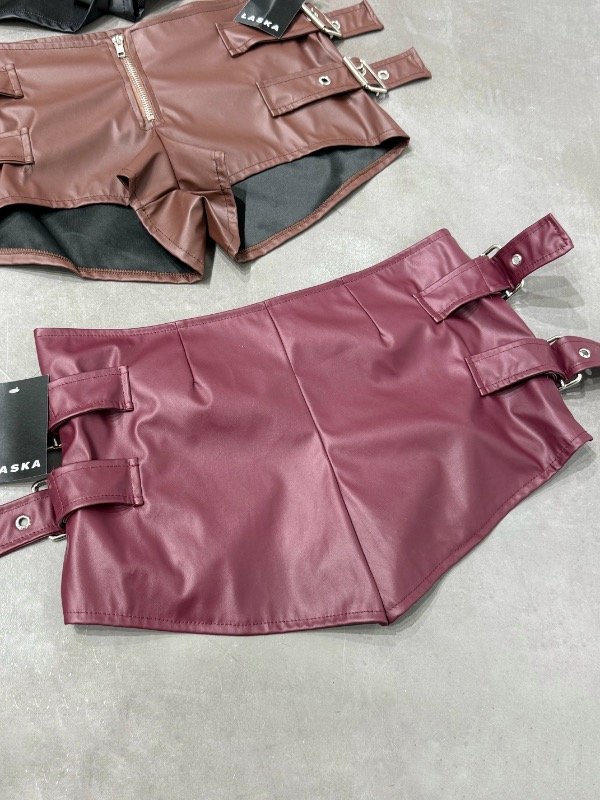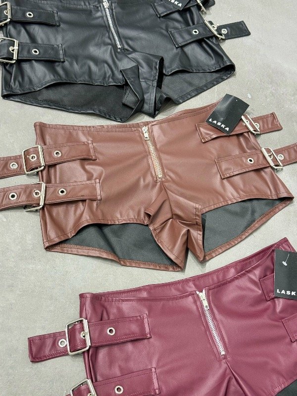 Short engomado tiro bajo con hebillas laterales y cierre delantero. Talle único, abarca 36/38.