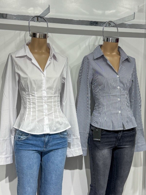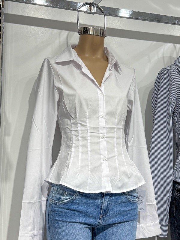 Camisa de tela poplin elastizada al cuerpo con pinzada con tablitas en la zona de la cintura. Disponible por talles.