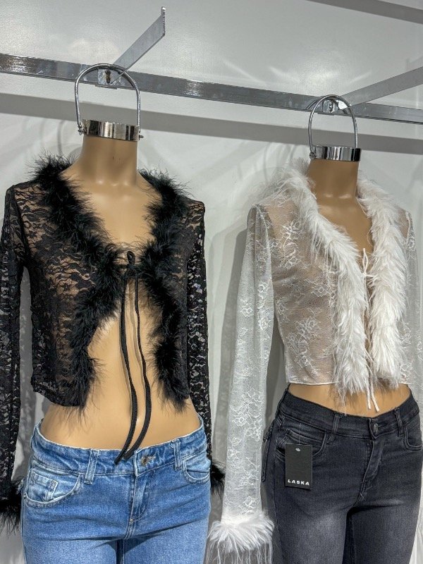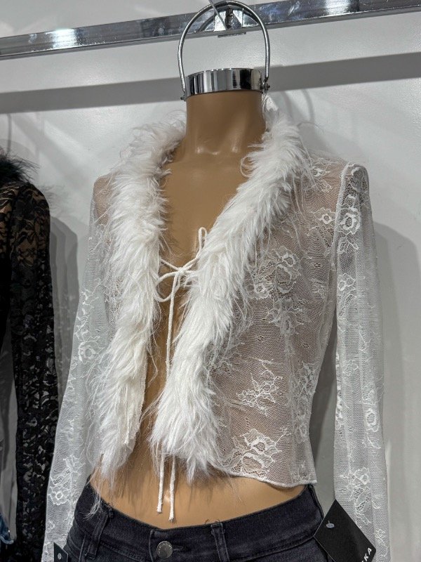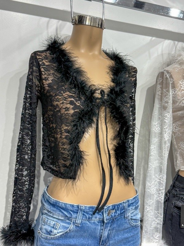 Saquito de encaje con plumas. Talle único, abarca S/M