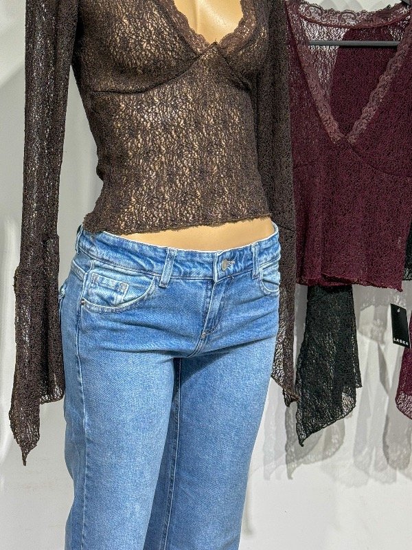 Top de encaje tramado cuello en V con puntilla con mangas murciélago y tajo. Talle único, abarca S/M.