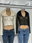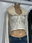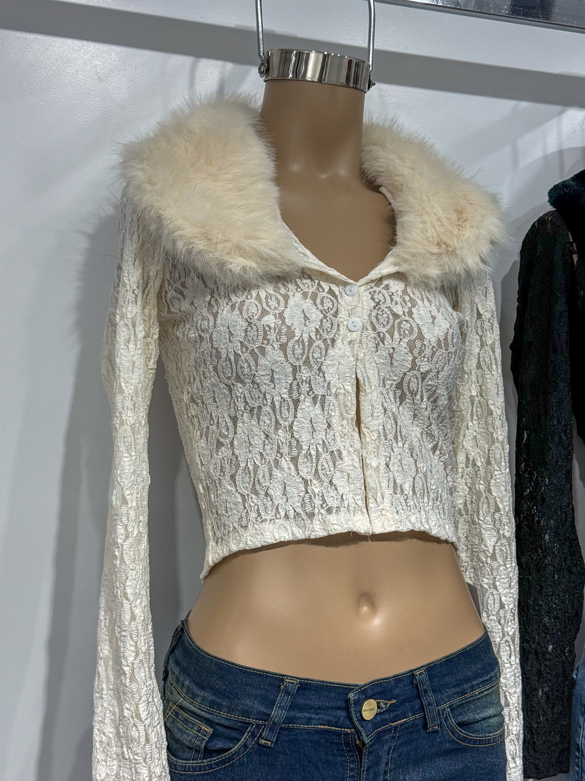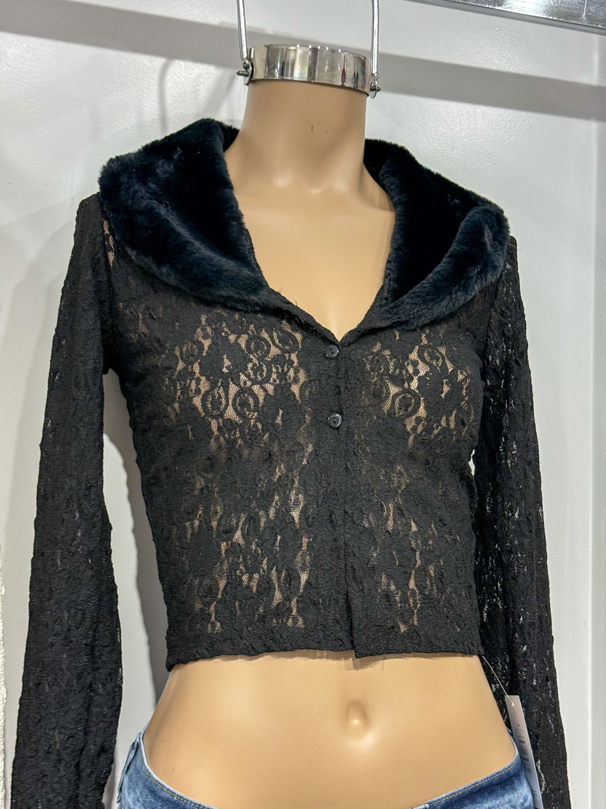 Top tipo saquito de encaje totalmente transparente con piel en la parte del cuello. Talle único, abarca S/M
