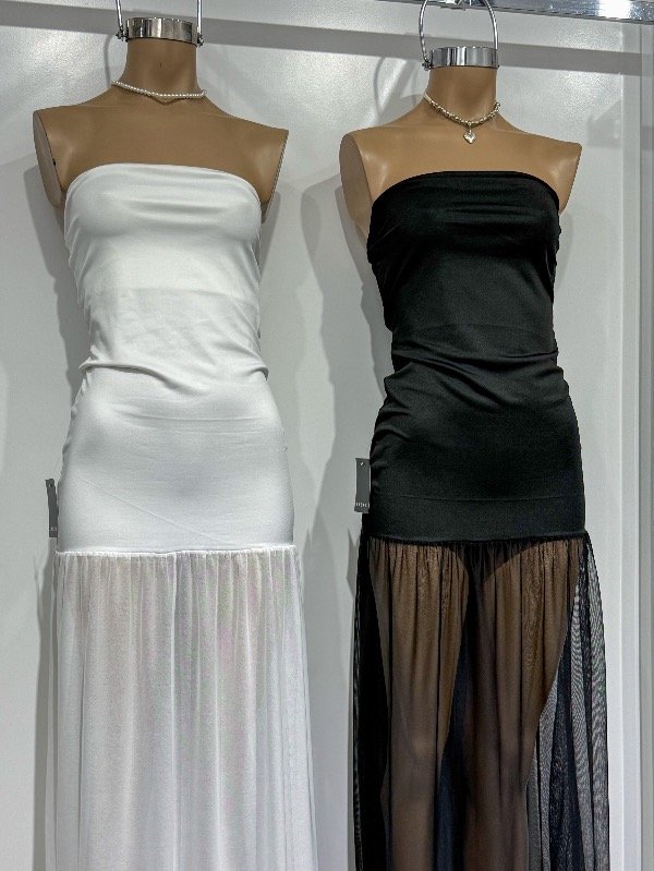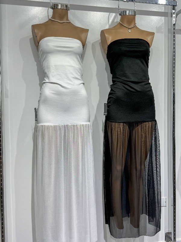 Vestido largo strapless de microfibra con micro tull. Talle único, abarca S/M