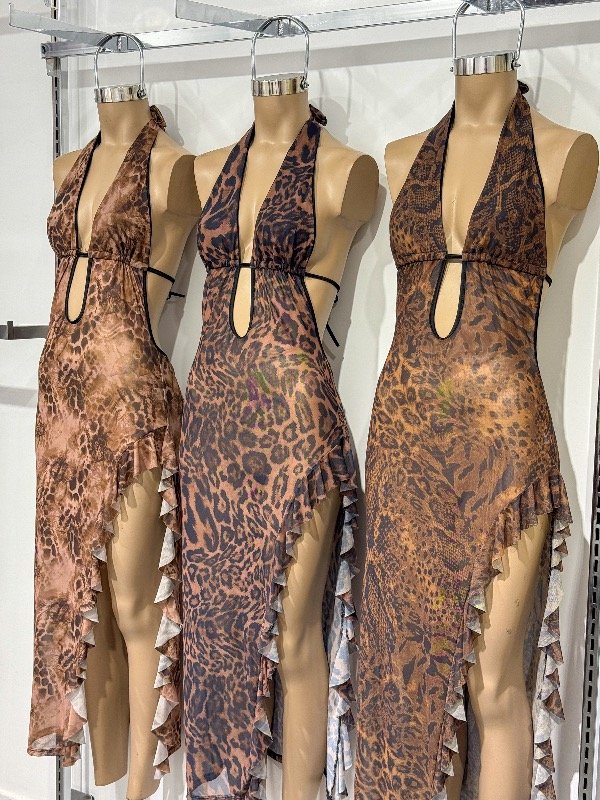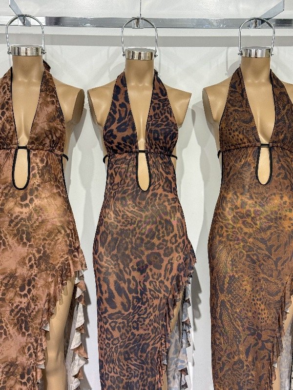 Vestido de micro tull sublimado transparente con escote en V, espalda semi descubierta y amplio tajo lateral. Talle único, abarca S/M