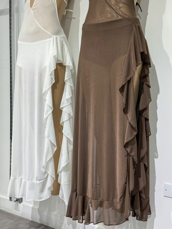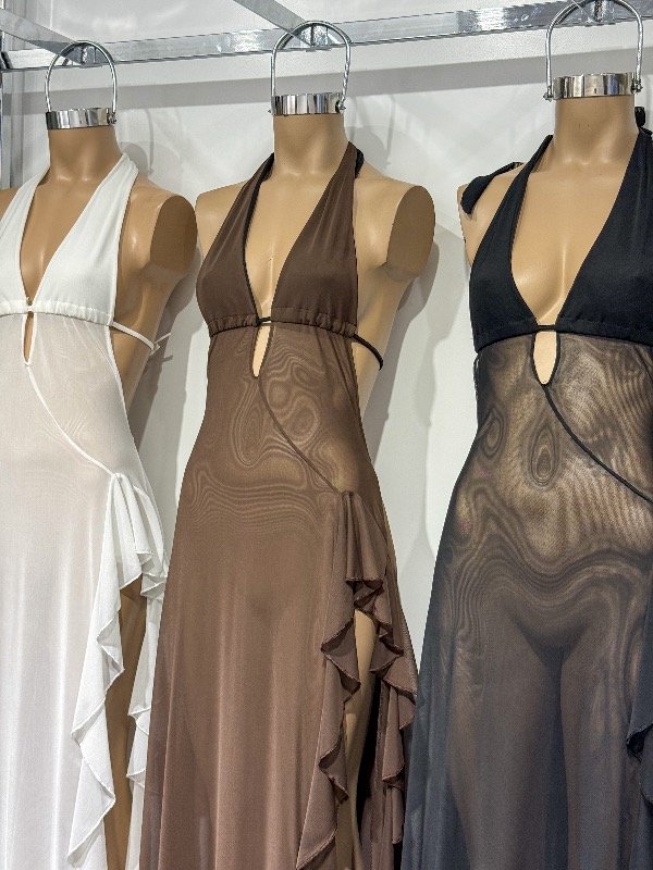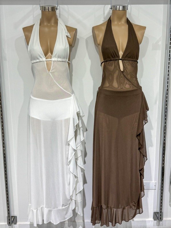 Vestido largo de micro tull con amplio tajo lateral con volados, cuello en V y espalda descubierta. Todo transparente con forro en el busto. Talle único, abarca S/M