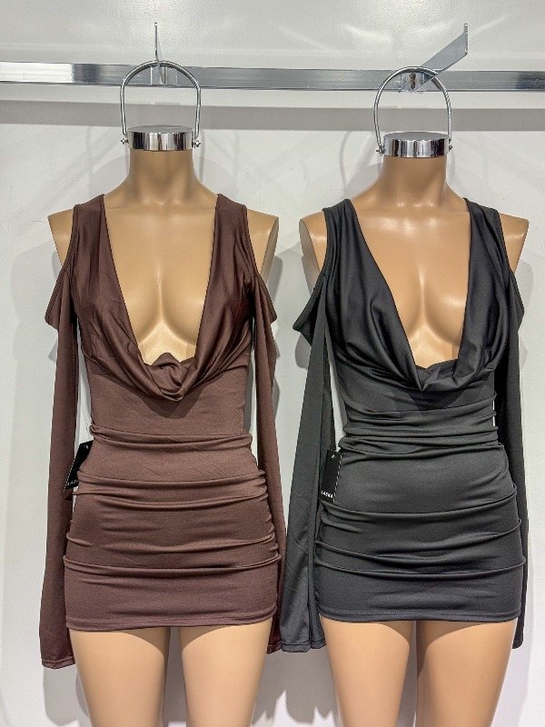 Vestido de microfibra con hombros cut out, manga Oxford y cuello buche. Talle único, abarca S/M