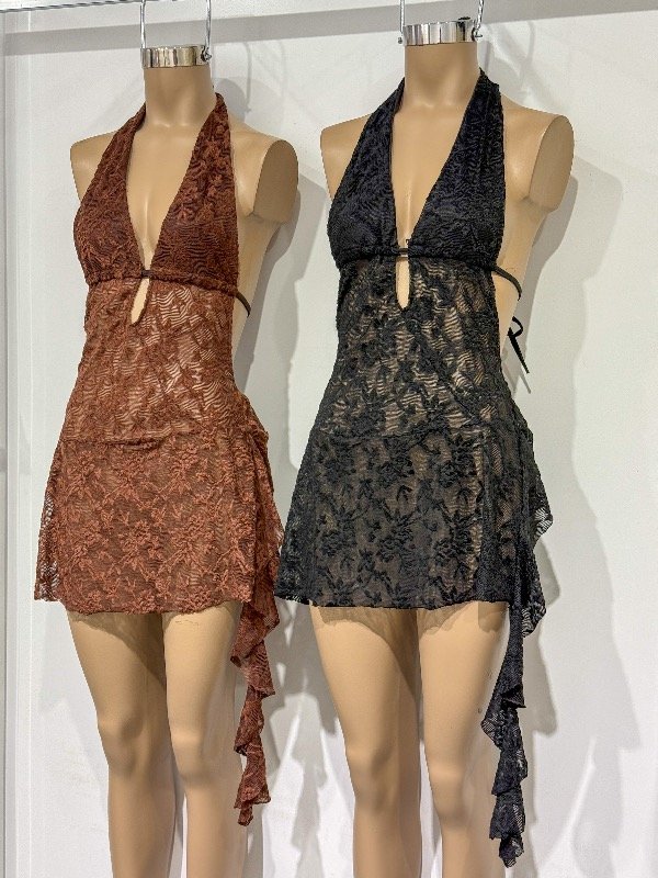 Vestido de encaje tramado. Cuello en V, espalda semi descubierta y lazo colgando en un lateral. Talle único, abarca S/M