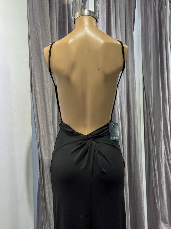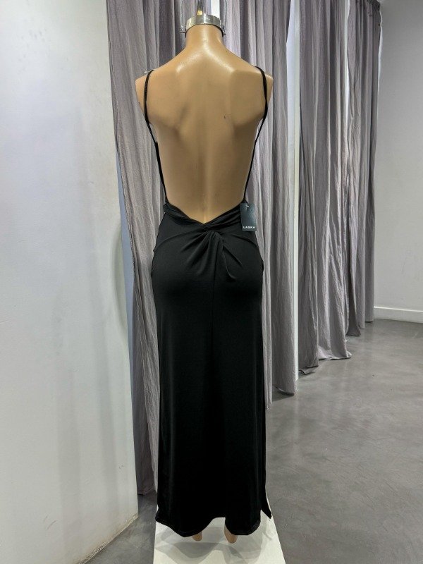 Vestido de microfibra cuello buche, espalda descubierta y nudo en la cola. Talle único, abarca S/M