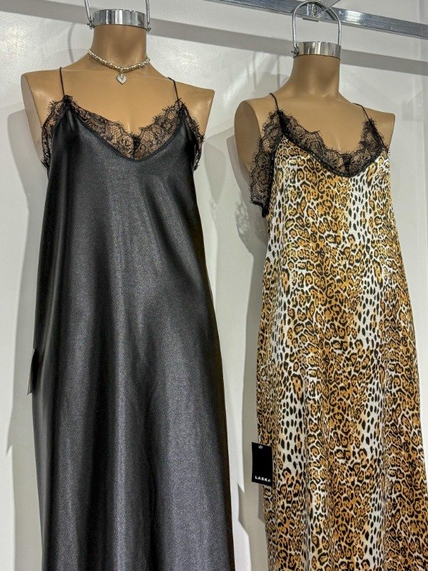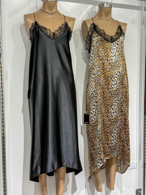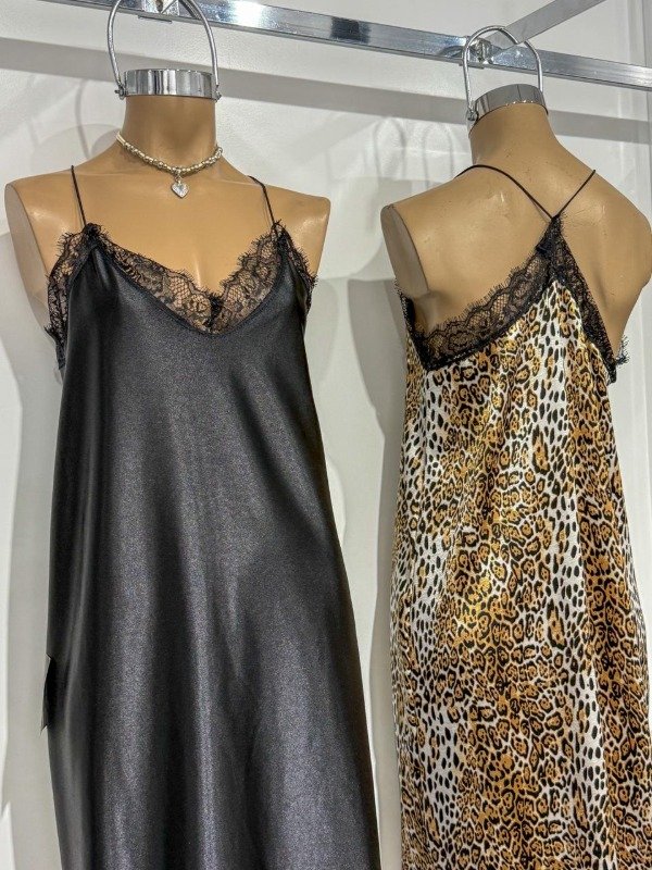Vestido lencero largo de satén con encaje en busto. Talle único, abarca un S/M.