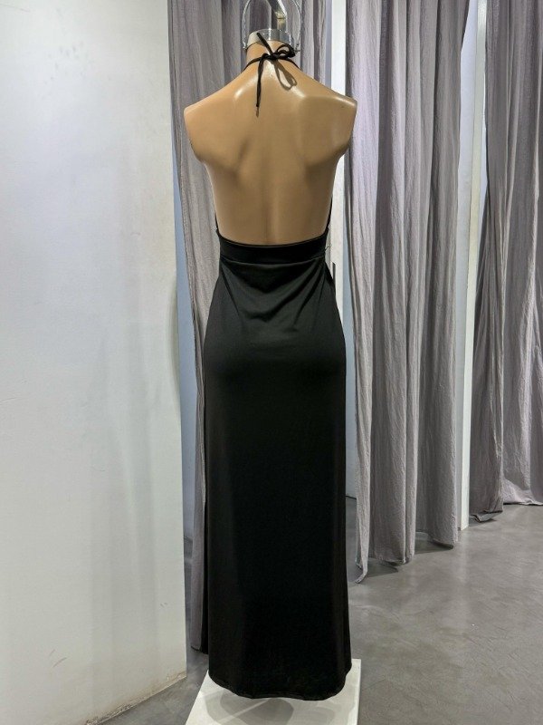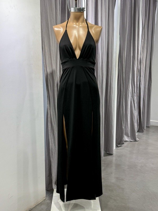Vestido de microfibra largo cuello en V, tía para anudar en el cuello, amplios tajos laterales y espalda semi descubierta. Talle único, abarca S/M