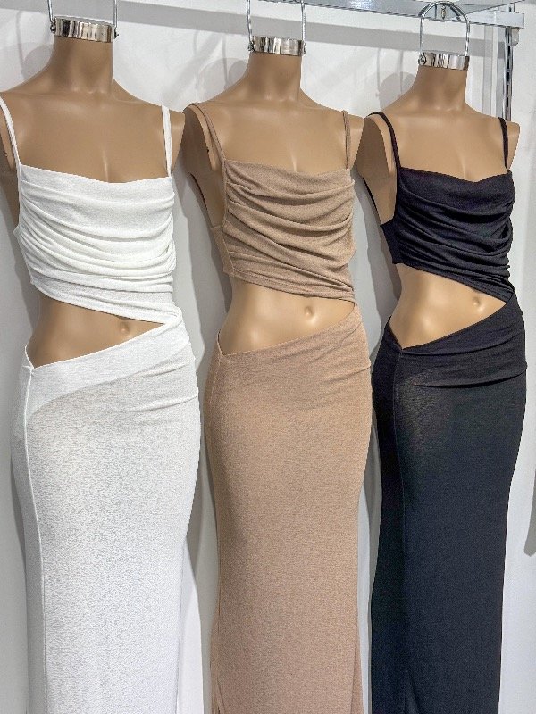 Vestido largo de tela fina, transparente, ultra elastiAda. Cuello buche y corte irregular en la parte central del vestido. Talle único, abarca S/M